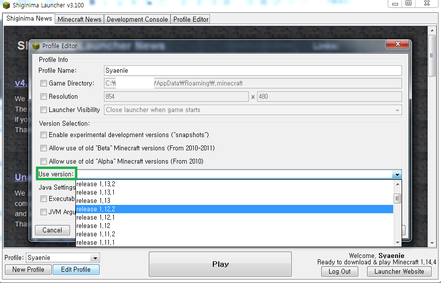 새로운 창이 뜨면서 엄청 많은 영어들이 뜨는데 어려운 것 하나도 없습니다. 초록박스의 Use version을 눌러서 release 1.12.2를 선택합니다.