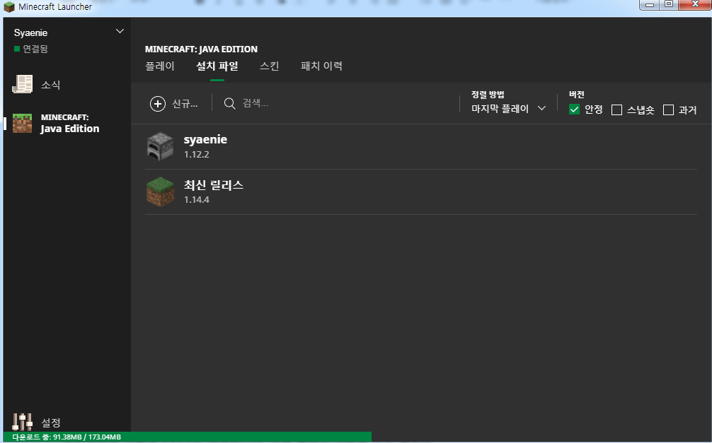 마인크래프트 런쳐를 들어가면 로그인 후 이런 화면이 나옵니다.